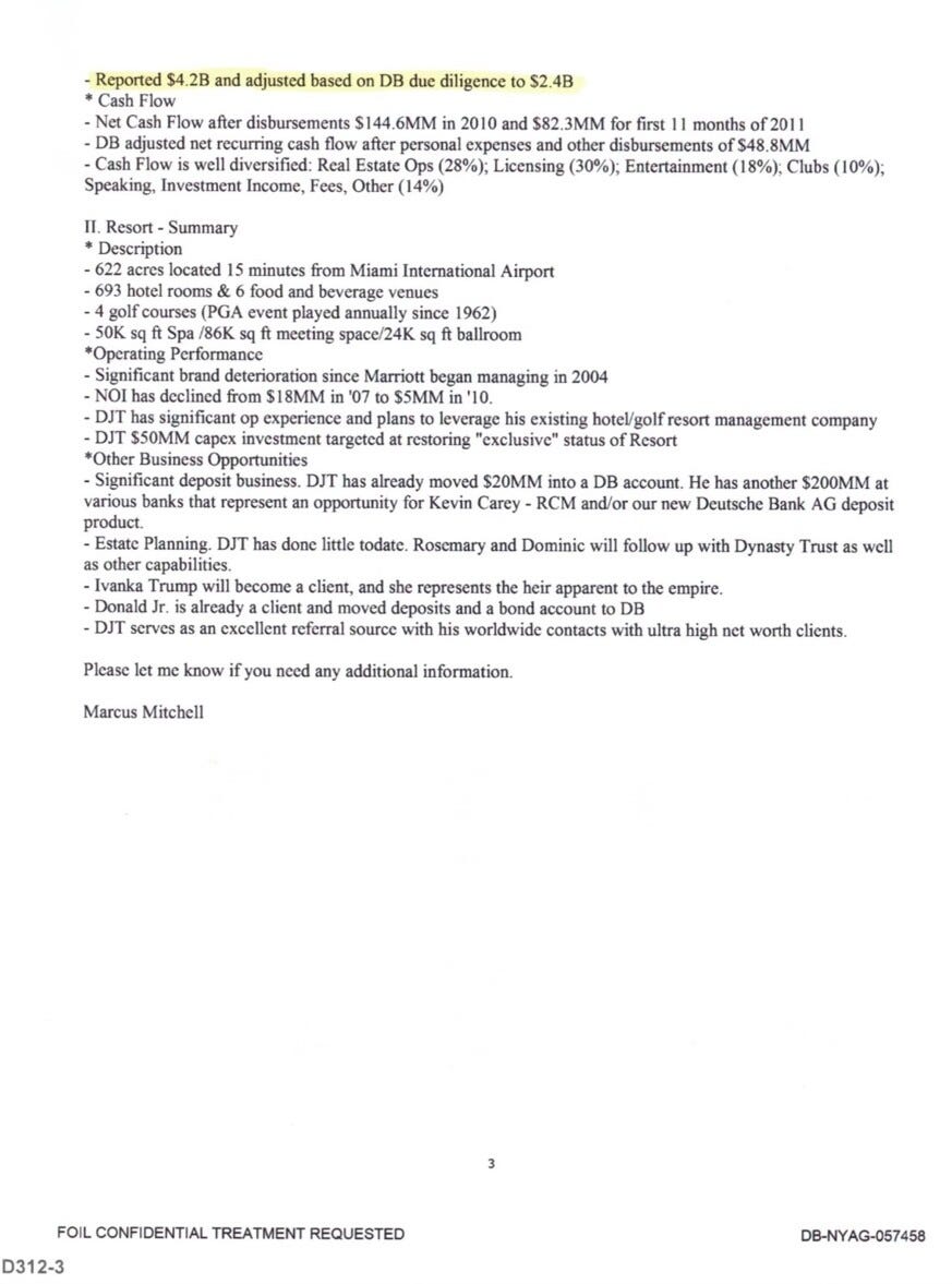 Moving on to point number two, the ultimate proof vindicating Trump of these charges is from the official letter from Deutsche Bank. They wrote that President Trump had one of “the strongest personal balance sheets we have seen and totally unlike any of our major RE developer clients,” and Trump represents “a great franchise opportunity,” and Trump is an expert “in successfully running world class assets.” Here is the letter for you to read with the highlighted key sections: