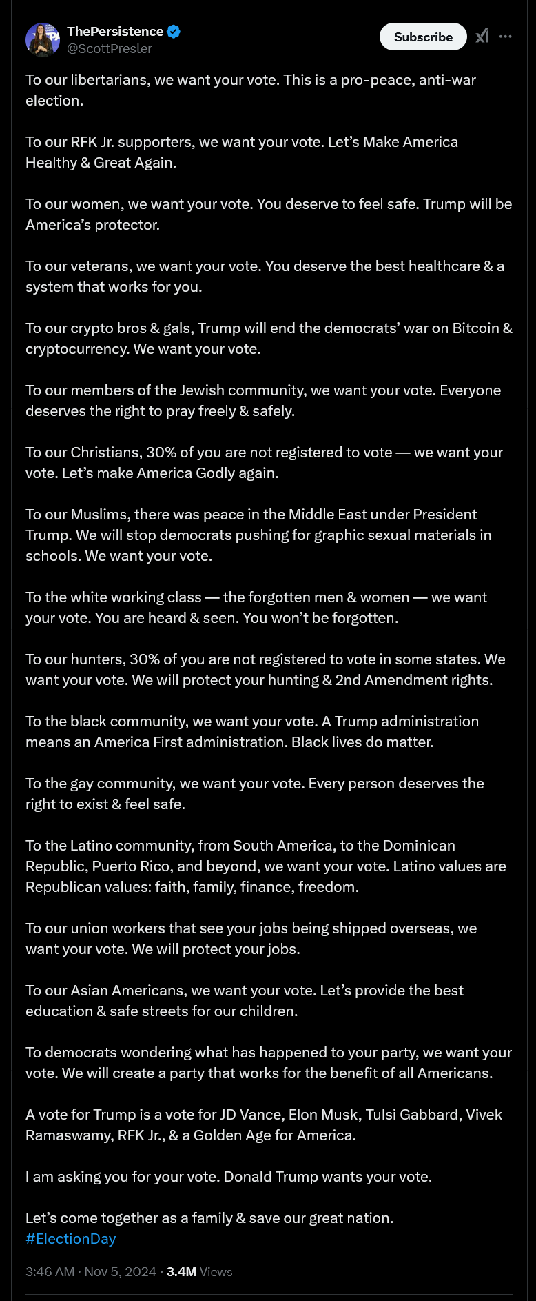 In the end, it was a multitude of factors that played into Trump’s once-in-a-lifetime victory. All of this can also be summarized into more simpler terms—Trump just ran a better campaign. One that the Democrats just could not even compare to. More importantly it was Trump’s campaign was ultimately superior because he took the time to correct from his mistakes from his previous race back in 2020. The 2024 campaign was a unity campaign, pledging to deliver a more thriving America ran by a coalition government of diverse perspectives having a seat at the table next to Trump. Scott Presler summarized it best in his final Tweet before we won the election.